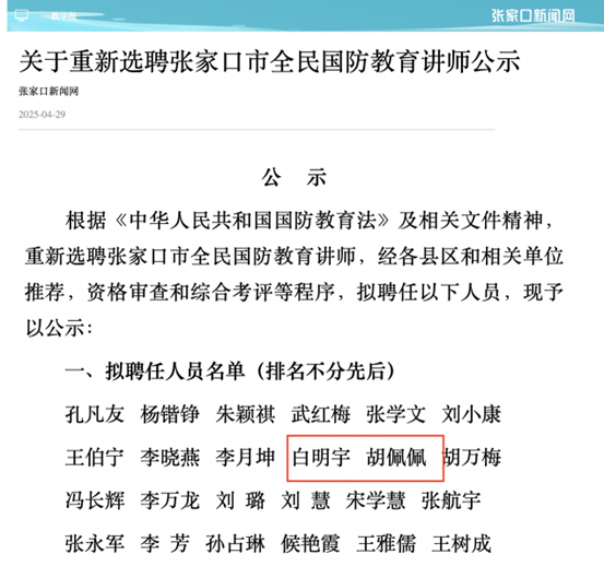 2025年4月,经张家口市委宣传部综合评审,公司军事理论教研室白明宇和胡佩佩两位老师被选聘担任张家口市全民国防教育讲师。