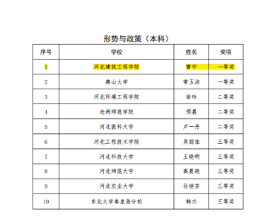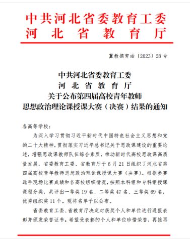 近日,由中共河北省教育工委、河北省教育厅组织的河北省第四届高校青年教师思政课授课大赛(决赛)在河北工程技术公司落下帷幕。来自全省各高校的135名优秀青年思政课教师,经过激烈角逐,英国365集团网站选派的青年教师曹宇获得本科组《形势与政策》课第一名、一等奖,青年教师朱思慧获得本科组《毛泽东思想和中国特色社会主义理论体系概论》课第五名、二等奖,创公司教师参加此项比赛以来历史最好成绩。