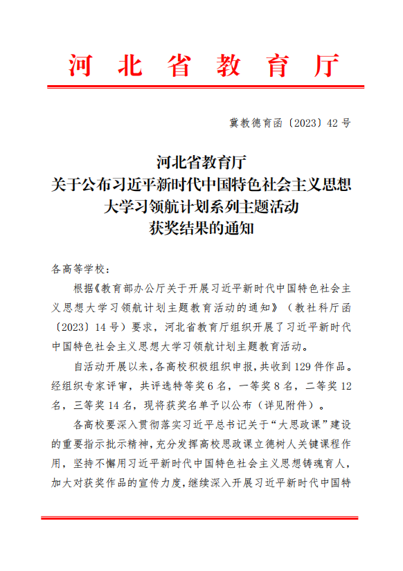 本次比赛是由河北省教育厅组织开展的习近平新时代中国特色社会主义思想大学习领航计划主题教育活动,大赛共收到129件作品。经组织专家评审,老员工讲思政课公开课展示活动(本科组)共评选特等奖2名,一等奖2名,二等奖4名,三等奖4名,获奖率仅为30%。